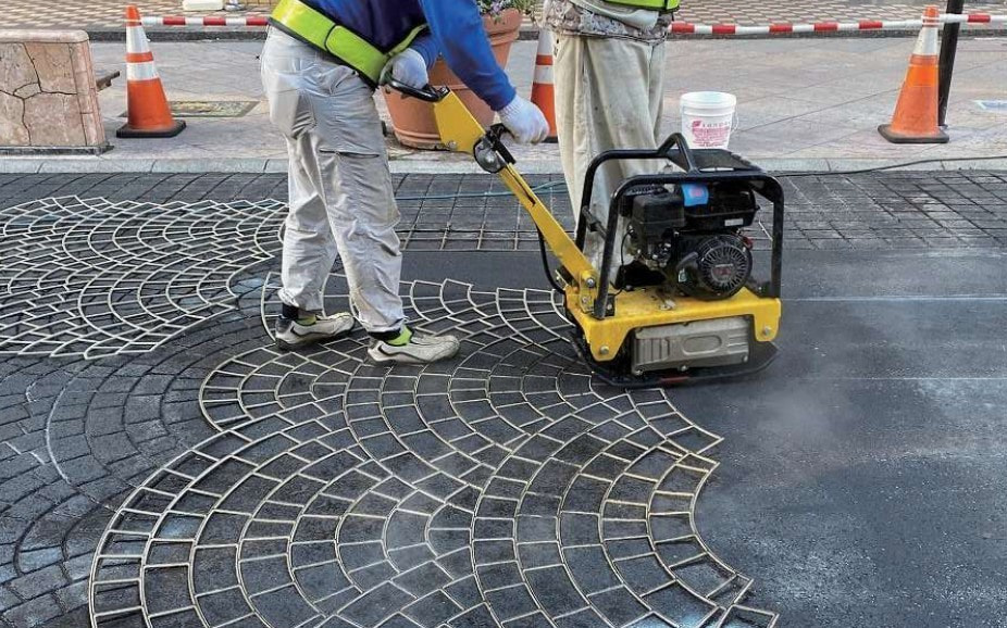 アースタンプは、型押しパネルで成形し、色を吹き付け、味気なかった黒色のアスファルト舗装を石畳やレンガ調の景観舗装に仕上げる新工法です。